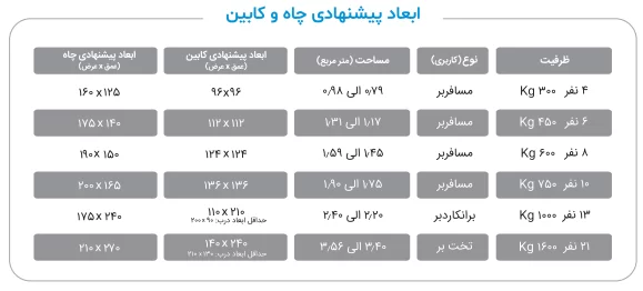 جدول ابعاد کابین آسانسور بر اساس ظرفیت