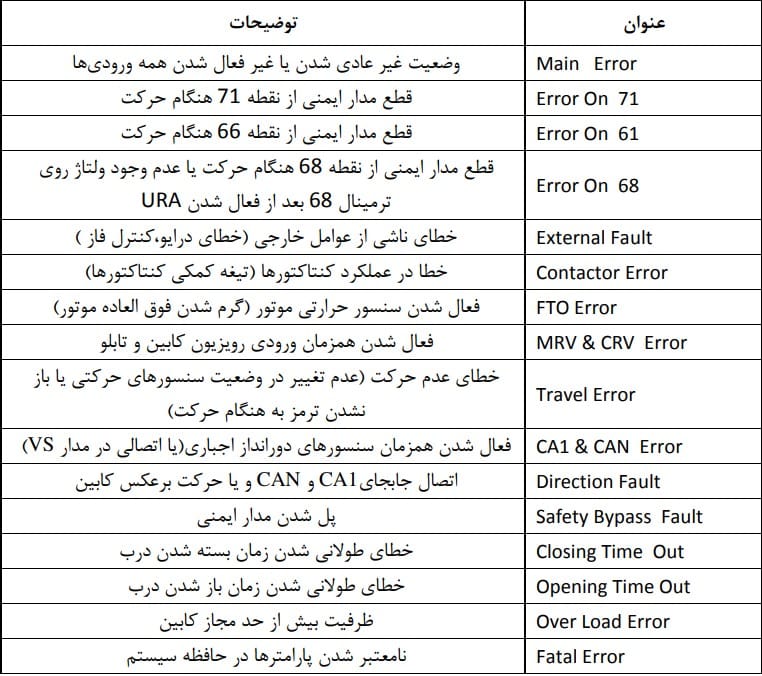 در این بخش، به تفصیل به خطاهای نمایش داده شده در تابلو فرمان آسانسور السا ELSA TECH میپردازیم که از طریق صفحه نمایش LCD آن قابل مشاهده هستند. درک این خطاها برای نگهداری و عیب یابی آسانسور السا امری حیاتی است.
